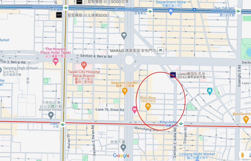 2 minute walk to Renai traffic circle, 7 minute to Xinyi Anhe station, 7 min walk to Zhongxiao Dunhua station.