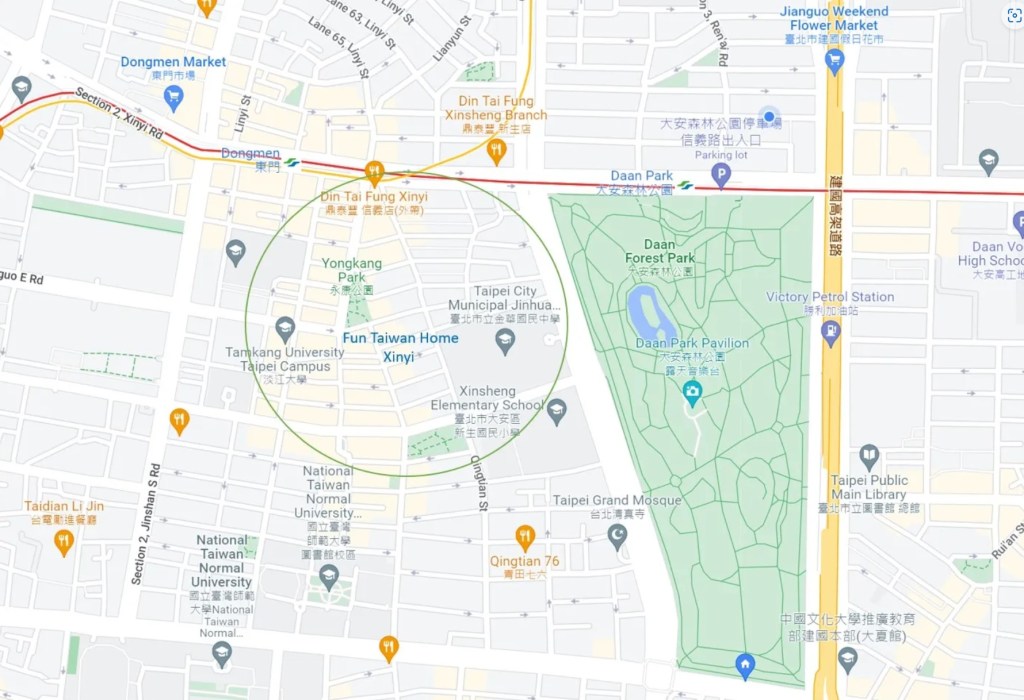 Fully furnished 3-bedroom apartment at Da’an Park. Din Tai Fung, and Yong Kang Street are at your doorstep, Xinyi Residence is nestled btw Dongmen MRT and Da’an Park MRT station. 1100 sqft, 3 bed, 2 bath, 1 living rm, 1 dining rm, and 1 kitchen. This apartment sits on the mid floor of an elevatored building with 24-hour guard and garbage management. The location is exceptional. Full of light and airy, perfect for family holidays in Taiwan. Washer, and separate dryer. Fully stocked kitchen with plenty of applicances.